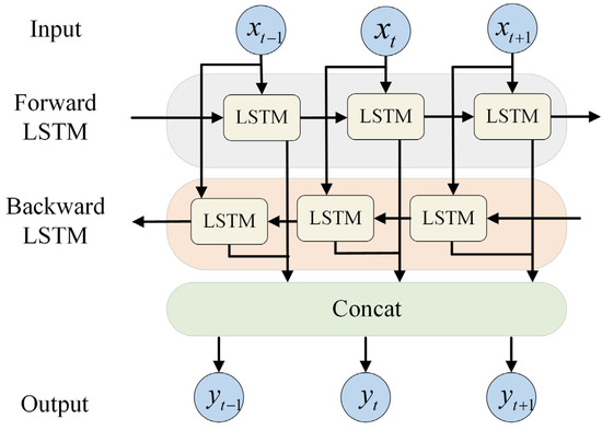 The BiLSTM is a class of recurrent neural networks proposed on the basis of recurrent neural networks (RNNs). As shown in Figure 6, the model consists of a forward LSTM and a backward LSTM, which can effectively extract the temporal features of the sequence data with the information of the preceding and following contexts so that it can understand the past and future behavioural characteristics of the customer; for example, if the customer frequently ordered the products of the enterprise in the past period of time, however, in the recent period of time, the frequency of the transactions decreased significantly, then the probability of the churn of this customer is greatly increased. As shown in Figure 7, the classical structure of the LSTM contains a forget gate, input gate, memory cell and output gate.
