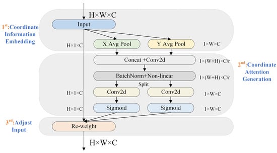 - Hou, Q.; Zhou, D.; Feng, J. Coordinate attention for efficient mobile network design. In Proceedings of the IEEE/CVF Conference on Computer Vision and Pattern Recognition, Nashville, TN, USA, 20–25 June 2021; pp. 13713–13722. [Google Scholar]