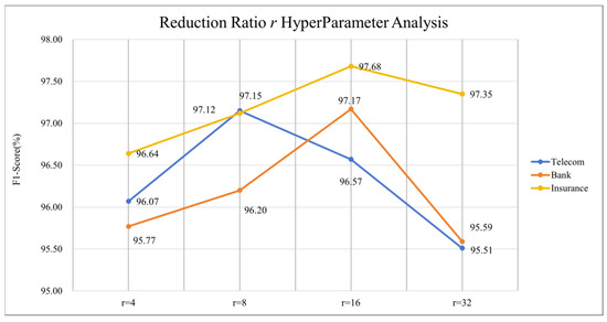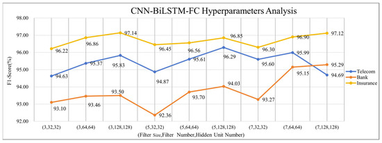 In order to further compare the performance of the coordinate attention mechanism with the other attention in this task, we selected the channel attention mechanism (SENet) [32] and the convolutional attention module (CBAM) [33] on the telecom dataset and the bank dataset. The experimental results are shown in Table 7 and Table 8. When SENet is added to the CNN-BiLSTM-FC model, the performance of the model is effectively improved. On the telecom dataset, the accuracy of the model is improved from 95.83% to 96.28%, the precision rate is improved from 95.20% to 96.39% and the F1-Score is improved from 96.29% to 96.54%. On the bank dataset, the model improves 0.75%, 0.72%, 0.22% and 0.47% in its accuracy, precision, recall and F1-Score, respectively. This indicates that SENet can effectively make the model focus on more important feature channels, thus improving the model performance. Adding CBAM to the CNN-BiLSTM-FC model is more effective than adding SENet, because CBAM not only captures the channel information of the feature map but also makes the model focus on more important spatial locations on the feature map. But it is still lower than the performance of CoAttention. When CoAttention is added on top of the CNN-BiLSTM-FC model, the model achieves the highest performance on both the telecom and bank dataset. In particular, it reaches 97.15% and 97.17% on the F1-Score metric, respectively. CoAttention improves the model performance with a corresponding increase in the number of parameters and computation time. On the telecom dataset, the number of parameters added by CoAttention reaches 7.26 MB, and the training time is 255.27 s. On the bank dataset, the number of parameters and training time are 8.56 MB and 264.62 s, respectively. In contrast, SENet and CBAM have slightly lower parameters and relatively shorter training times, but the performance improvement is far less significant than CoAttention.