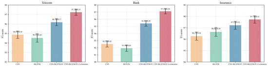 To validate the improvement in the performance of the proposed model, we conduct experiments using error bars on the three datasets used and compare the performance of the different models using the F1-Score as an indicator. As shown in Figure 11, compared to a single network (e.g., CNN or BiLSTM), the CNN-BiLSTM-FC exhibits smaller fluctuations on all three datasets, demonstrating the effectiveness and stability of the feature extraction method via multiple networks. The CNN-BiLSTM-FC-CoAttention model has the smallest confidence interval width on all datasets, especially the insurance dataset. On the dataset, the confidence interval of CNN-BiLSTM-FC-CoAttention is 97.73% ± 0.32, while the confidence intervals of the CNN, BiLSTM and CNN-BiLSTM-FC are 96.27% ± 0.36, 96.64% ± 0.39 and 97.22% ± 0.35, respectively, which confirms the CNN-BiLSTM-FC- CoAttention model’s superior robustness and stability, making it well adapted to complex churn prediction tasks.