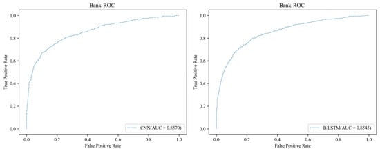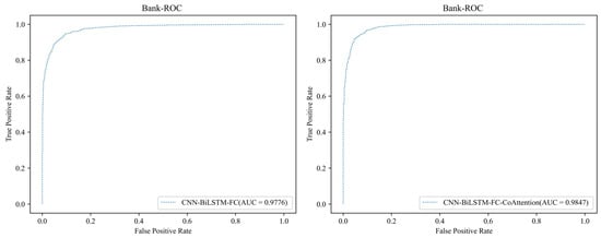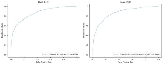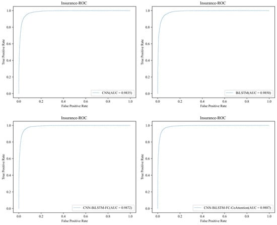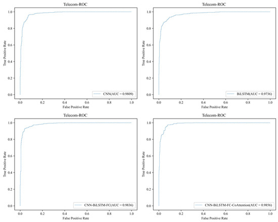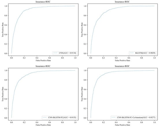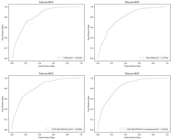 The experimental results on the original imbalanced dataset are shown in Figure 12, Figure 13 and Figure 14. It can be seen that compared to the CNN model, BiLSTM model and CNN-BiLSTM-FC model, the curve of the CNN-BiLSTM-FC-CoAttention model on the three datasets is closer to the upper left corner, which illustrates that the model is able to fit the complex customer data better. On the telecom dataset, the CNN-BiLSTM-FC-CoAttention achieves an AUC value of 83.37%, which is 1.25%, 3.77% and 0.71% higher compared to the CNN, BiLSTM and CNN-BiLSTM-FC. On the bank dataset, the AUC value of the CNN-BiLSTM-FC-CoAttention is 86.40%, which is higher than the AUC values of the CNN, BiLSTM and CNN-BiLSTM-FC. The CNN-BiLSTM-FC-CoAttention also achieved the highest AUC value of 92.77% on the insurance dataset. Therefore, the CNN-BiLSTM-FC-CoAttention enables the model to effectively adapt to unbalanced datasets by extracting different features and fusing the attention mechanism, thus improving the overall performance of the model.