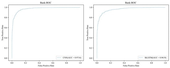 In order to further validate the improvement of the performance of the proposed model, we use the ROC curve and AUC value to evaluate the performance of the proposed model on the imbalanced dataset and the balanced dataset. The ROC curve effectively describes the change in the model’s performance with the threshold value, and the closer to the upper left corner of the model’s curve implies that the model’s performance is better. The horizontal coordinate, the False Positive Rate (FPR), represents the proportion of samples that are actually non-churned customers but are predicted to be churned, while the vertical coordinate, the True Positive Rate (TPR), represents the proportion of churned customers that are correctly predicted. The area under the curve (AUC) of the ROC is also an important measure of the model’s performance, with an area closer to one indicating the model’s ability to identify churn customers.