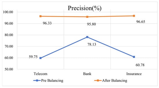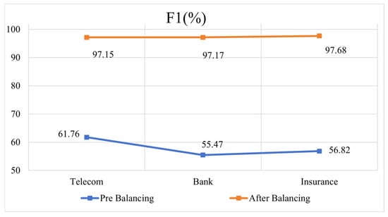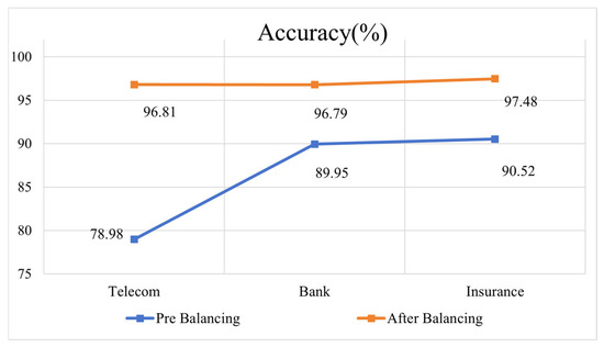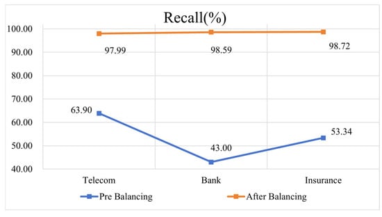 The experimental results show that processing the imbalanced dataset by the resampling technique can significantly improve the performance of the model on all the metrics. From the experimental results in Figure 13, it can be seen that on the original dataset without the use of the SMOTE-ENN, the model performs lower in terms of accuracy, especially on the telecom dataset, where the accuracy is only 78.98%. This is due to the fact that the original dataset has fewer churned customers and the model is fitted towards non-churned customers during the training process, resulting in an insufficient predictive power for the sample of churned customers. Whereas, after using the SMOTE-ENN, the accuracy of the model is significantly improved, reaching 96.81% (telecom dataset), 96.79% (bank dataset) and 97.48% (insurance dataset), respectively. It indicates that balancing the dataset by the resampling technique makes the model more effectively learn the features of few classes and thus improves the prediction accuracy. From Figure 14, it can be seen that the precision of the model improves substantially after resampling, especially on the telecom dataset and the insurance dataset, by 36.58% and 35.87%, respectively. It indicates that the use of the SMOTE-ENN can effectively reduce the misjudgement rate of the model for non-churned customers, thus effectively improving the accuracy rate. As can be seen from Figure 15, on the original dataset without the use of the SMOTE-ENN, the recall rate of the model is low, which indicates the poor ability to identify the churn customer samples. The SMOTE-ENN improves the recall of the model by synthesising a few classes and eliminating the noisy data, reaching 97.99% (telecom dataset), 98.59% (bank dataset) and 98.72% (insurance dataset), respectively. The F1-Score, which is the harmonic mean of the precision rate and the recall rate, is able to comprehensively reflect the performance of the model. According to the results in Figure 16, the F1-Score of the models without using resampling techniques are poor, especially on the bank dataset and insurance dataset, which are 55.47% and 56.82%, respectively. Whereas, using the SMOTE-ENN, the F1-Score of the models are significantly improved, reaching 97.15% (telecom dataset), 97.17% (bank dataset) and 97.68%(insurance dataset), respectively. This indicates that the SMOTE-ENN can enable the model to maintain a high precision rate while improving the model’s ability to recognise a small number of classes, thus improving the overall performance of the model.