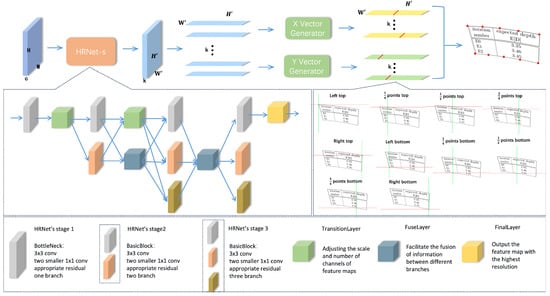 Our algorithm is inspired by the lightweight keypoint detection network SimCC [], with significant improvements to better accommodate the characteristics of table images. Unlike SimCC, our approach not only transforms the regression problem into a classification problem but also enhances both accuracy and efficiency by optimizing feature extraction and keypoint prediction. We specifically adopted an optimized version of HRNet [] as the backbone network and introduced a new architecture, HRNet-s, as shown in Figure 2. By removing the fourth stage of HRNet and retaining only the first three, we reduced the model’s complexity while preserving its strong feature extraction capabilities for table images.