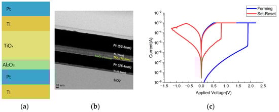 (a) A schematic, (b) a transmission electron microscope (TEM) image, and (c) typical I-V curve (forming, set, and reset) of the Al2O3-based RRAM device used in this work.