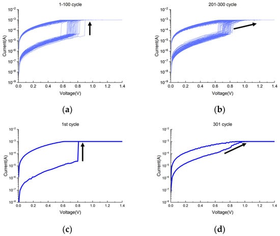 I-V curves of RRAM device during cycling (Forming 2.2 V, set 1.4 V, reset −1.2 V): (a) cycles 1–100; (b) cycles 201–300; (c) first cycle; (d) 301st cycle.