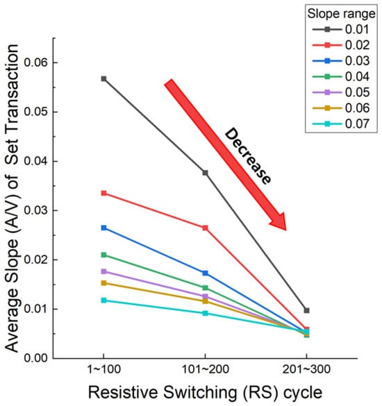 Average slope (A/V) of set transition according to resistive switching (RS) cycle 1 to 100, 101 to 200, and 201 to 300.