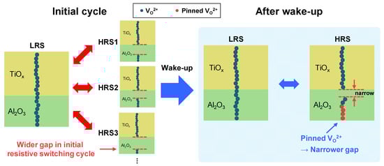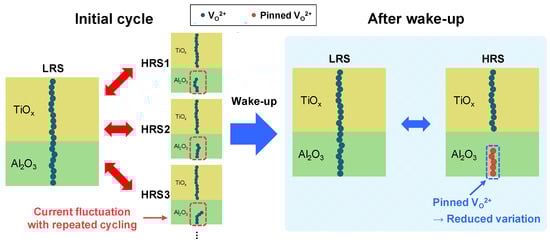 In the condition where current variation was reduced, the reset voltage was increased to −1.3 V, while the set voltage was reduced to 1.2 V. Compared to the previous bias condition, this combination of a stronger reset and a weaker set operation facilitated more effective rupture of the CF. Simultaneously, the higher electric field during the reset process led to an increased number of immobilized oxygen vacancies within the Al2O3 layer. This reduction in current variation can be attributed to two key mechanisms. First, with repeated cycling, oxygen vacancies become increasingly immobilized in the Al2O3 layer, which suppresses uncontrolled CF rupture and promotes more spatially consistent rupture and regrowth sites. Moreover, the presence of pinned vacancies may facilitate TAT, enabling localized charge transport paths that guide filament regrowth along energetically favorable and spatially fixed locations. This effect promotes variation suppression by repeatedly utilizing the same conduction path during set and reset operations, thus stabilizing the switching behavior [,]. Second, repeated FN tunneling during switching may cause gradual structural deformation of the Al2O3 thin film [], thereby guiding CF formation toward energetically and structurally favorable locations. As illustrated in Figure 8, the accumulation of pinned vacancies after the wake-up effect contributes to the formation of more uniform conductive filaments. This structural stabilization reduces stochasticity in the switching behavior and enhances the overall reliability of the device. Furthermore, since the CF is not fully ruptured due to pinning along TAT-guided sites, a higher residual reset current is also observed, consistent with the data in Figure 6b.