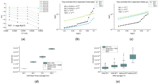Temperature- and cycling-dependent conduction characteristics of the RRAM device (Forming 2.2 V, Set 1.2 V, Reset −1.3 V): (a) ln(I)–1/T plots at various voltages confirming the validity of the TAT model up to ~0.6 V; (b) log(I)–log(V) plots showing the emergence of trap-controlled SCLC conduction beyond ~0.5 V; (c) Extracted slope values (n) as a function of voltage and temperature before and after wake-up; (d) Temperature dependence of LRS read current at 0.2 V, consistent with thermionic emission behavior; (e) HRS read current at 0.1 V before and after wake-up at 25 °C and 50 °C, showing enhanced leakage due to residual oxygen vacancies.