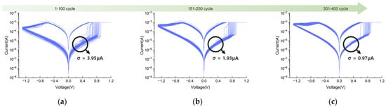 During the initial cycles (Figure 6a), noticeable fluctuations in the HRS current were observed during voltage sweep—reflecting unstable switching behavior—with a standard deviation of 3.95 μA at read voltage (0.4V). As cycling progressed to the mid-range (Figure 6b), the HRS variation was significantly reduced (σ = 19.3 μA), indicating a transition toward more uniform RS. By cycles 301 to 400 (Figure 6c), the variation further decreased to 0.97 μA, corresponding to a reduction of approximately 75% compared to the initial cycles. (3.95 μA to 0.97 μA).