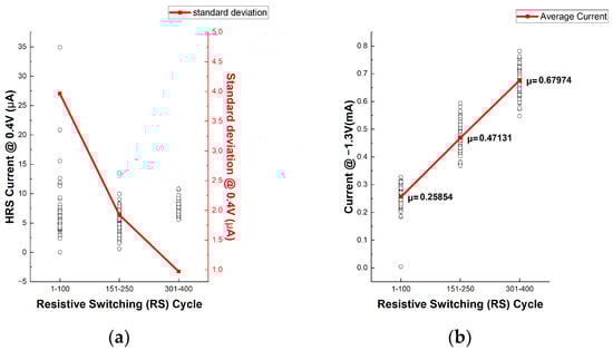 (a) HRS current (in mA) at read voltage 0.4 V (left y axis) and its standard deviation (right y axis) during cycles 1–100, 151–250 and 301–400 cycles; (b) current at −1.3 V and its average value over the same cycle intervals.