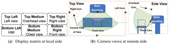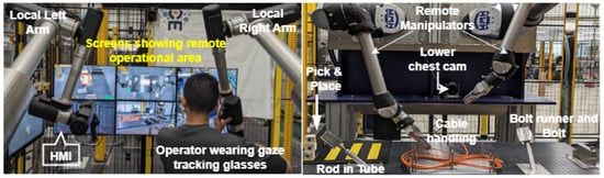 The Telbot system is a bilateral telerobotic system equipped with remote manipulators that offer seven degrees of freedom and can carry loads of up to 20 at their end effectors. These manipulators are controlled by local robots that are kinematically similar, each featuring six degrees of freedom. Human operators manage these local robots, ensuring precise and responsive control. Five cameras are positioned on the remote side, as shown in Figure 2b, capturing images that are then projected onto monitors in front of the operators, including the HMI of the telerobotic system, as shown in Figure 1 (left) and Figure 2a.