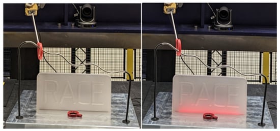 - Wire loop: In this task, users guide a metal loop (probe) along a winding wire path without touching the wire (see Figure 4) [47]. If contact occurs, an electric circuit triggers light and sound (a buzzing noise), indicating an error. Participants are instructed to navigate the probe back and forth, minimizing contact to assess the system’s positional accuracy and sensitivity.