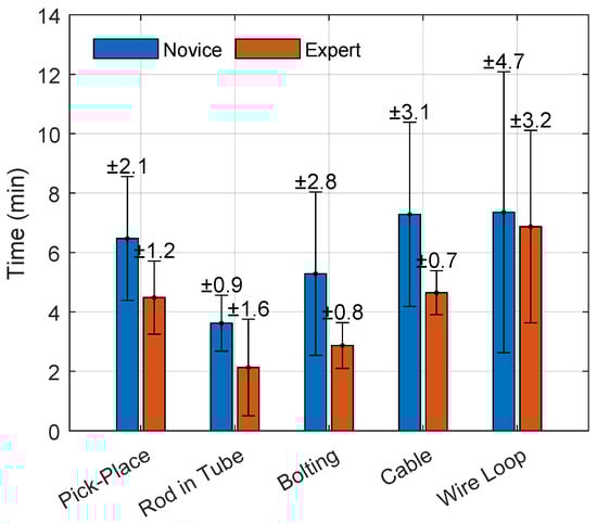 In the wire loop task, expert users not only completed the task more rapidly but also made fewer mistakes compared to novice users, as detailed in Table 2. Conversely, in the pick-and-place task, expert users exhibited a higher frequency of errors. Specifically, they encountered difficulty distinguishing the weights of the light and medium blocks. This difference may be attributed, as mentioned by experienced operators during interviews, to the extensive experience they have with the MASCOT system [49,50], which reflects less electromechanical impedance relative to the operators compared to the system under consideration.
