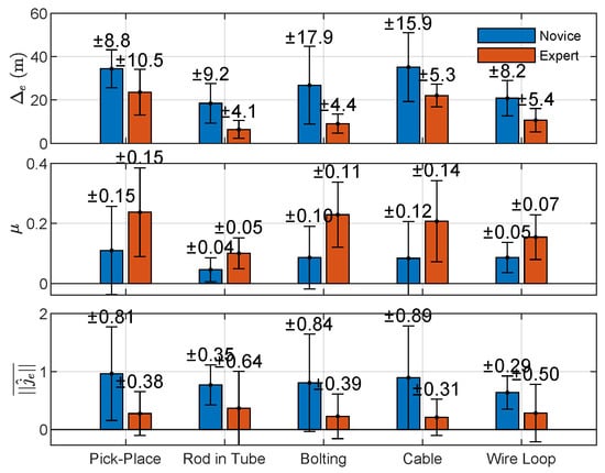 Moreover, not only do expert operators control remote manipulators with less displacement and optimal postures but they also execute smoother movements. This is supported by a statistically significant difference () in the remote manipulator’s total jerk when comparing expert and novice operators.