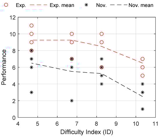 Expert operators (red circles) maintained high performance at lower difficulty levels (ID 4–6) but experienced a slight decline as difficulty increased beyond ID 6. While their performance dropped with more complex tasks, they remained relatively consistent compared to novices.