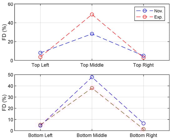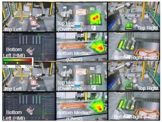 The gaze heat map for the tasks, illustrated in Figure 9, offered insights into the distinct approaches employed by expert and novice operators. Previous studies have suggested that fixation duration, representing the total time spent in fixations, reflects the information processing load and tends to increase with workload [24]. Here, similarly to [24], the absolute fixation duration time is scaled to a percentage of the exercise duration as