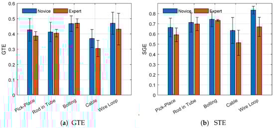 Experts demonstrate more focused, consistent, and goal-oriented gaze patterns, whereas novices tend to exhibit more random and erratic eye movements. The lower GTE and SGE values for experts suggest that they manage their gaze more efficiently and with greater control during task execution. This is particularly evident in tasks like “Wire Loop” and “Cable Handling”, where experts show significantly lower entropy, while novices display more irregular gaze behaviour.