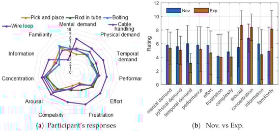 Figure 12b displays the user responses to the questionnaires categorized by their experience level. Overall, experts showed higher levels of arousal (), concentration (), and familiarity with the tasks (), while novices reported higher temporal demand ().