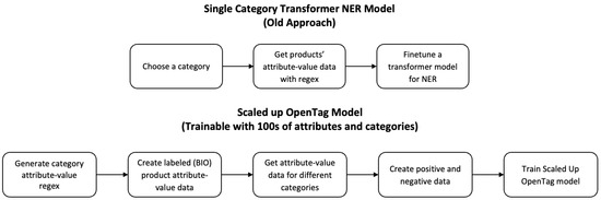 However, while effective for attribute extraction within predefined categories, this approach has inherent scalability limitations. Figure 2 illustrates the transition from a restricted, category-specific NER model to a more adaptable and scalable OpenTag model for e-commerce attribute extraction. The Single Category Transformer NER Model (old approach) operates by selecting a specific category, extracting attribute–value pairs using regex, and fine-tuning a transformer model tailored to that category. This method restricts its generalization across diverse product types. In contrast, the scaled-up OpenTag model, used in this study, is designed to process hundreds of attributes and categories simultaneously. This approach begins with regex-based attribute–value generation, followed by creating labeled (BIO) data for different categories and generating positive and negative examples to enhance model training. As a result, it enables efficient, large-scale attribute extraction across multiple product categories, effectively overcoming the limitations of category-specific NER models.