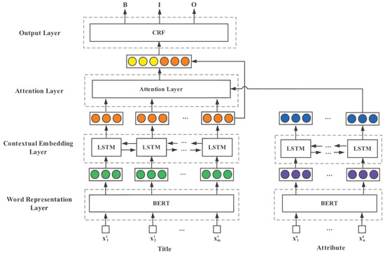 To further enhance the attribute extraction process and address the limitations of traditional NER models, a more advanced neural network architecture was designed. This architecture integrates multiple DL components to improve contextual understanding and classification accuracy. In Figure 3, a layered neural network architecture for attribute extraction is depicted, aligning with the study’s goal to develop a robust system for automated attribute extraction in e-commerce. The architecture begins with a Word Representation Layer using BERT, which generates context-aware embeddings for tokens within product titles and attributes, capturing essential linguistic nuances. These embeddings feed into a Contextual Embedding Layer consisting of bi-directional LSTM units, which refine the contextual representation by considering sequential dependencies in both forward and backward directions. An Attention Layer then highlights the most relevant parts of each sequence, enabling the model to focus on crucial tokens for accurate attribute identification. Finally, a Conditional Random Field (CRF) Output Layer classifies each token into beginning (B), inside (I), or outside (O) of an attribute, enhancing prediction consistency by enforcing label dependencies. This architecture combines DL and attention mechanisms to improve the extraction accuracy of complex, context-dependent product attributes, thus fulfilling the paper’s objective of advancing attribute extraction capabilities for Trendyol’s e-commerce platform.