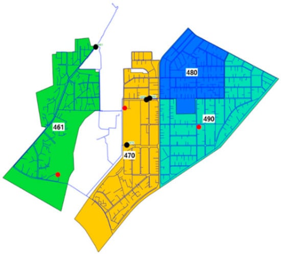 Secondary data refers to information that has already been gathered or produced. These datasets are often collected by government agencies or organizations before being repurposed for new studies. Unlike primary data collection, which requires direct interaction with subjects or environments, secondary data are readily available. These sources provide valuable insights, allowing them to be further analyzed [10]. Secondary data were collected from water quality observations conducted within a water supply system in Daegu, South Korea. Water quality was monitored at seven stations during March 2024 over a seven-day period, with data recorded at one-minute intervals continuously for 24 h each day. These seven stations comprised three monitoring points situated at the endpoints (marked in red) and four points along the pipeline inflow (marked in black), as depicted in Figure 1.