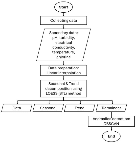 The following supporting information can be downloaded at: https://www.mdpi.com/article/10.3390/electronics14101933/s1, Figure S1: STL decomposition for Inflow Point 470 (pH, Turbidity, Electrical Conductivity, Temperature and Chlorine). Figure S2: STL decomposition for Inflow Point 480 (pH, Turbidity, Electrical Conductivity, Temperature, and Chlorine). Figure S3: STL decomposition for Inflow Point 490 (pH, Turbidity, Electrical Conductivity, Temperature, and Chlorine). Figure S4: STL decomposition for End Point 461 (pH, Turbidity, Electrical Conductivity, Temperature, and Chlorine). Figure S5: STL decomposition for End Point 470 (pH, Turbidity, Electrical Conductivity, Temperature, and Chlorine). Figure S6: STL decomposition for End Point 490 (pH, Turbidity, Electrical Conductivity, Temperature, and Chlorine). Figure S7: Anomalies detection using DBSCAN for Inflow Point 461 (pH, Turbidity, Electrical Conductivity, Temperature, and Chlorine). Figure S8: Anomalies detection using DBSCAN for Inflow Point 470 (pH, Turbidity, Electrical Conductivity, Temperature, and Chlorine). Figure S9: Anomalies detection using DBSCAN for Inflow Point 480 (pH, Turbidity, Electrical Conductivity, Temperature, and Chlorine). Figure S10: Anomalies detection using DBSCAN for Inflow Point 490 (pH, Turbidity, Electrical Conductivity, Temperature, and Chlorine). Figure S11: Anomalies detection using DBSCAN for End Point 461 (pH, Turbidity, Electrical Conductivity, Temperature, and Chlorine). Figure S12: Anomalies detection using DBSCAN for End Point 470 (pH, Turbidity, Electrical Conductivity, Temperature, and Chlorine). Figure S13: Anomalies detection using DBSCAN for End Point 490 (pH, Turbidity, Electrical Conductivity, Temperature, and Chlorine).