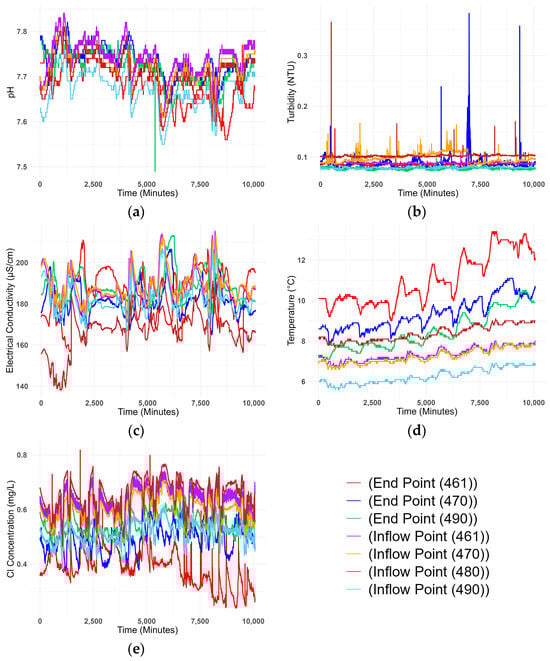 For pH, deviations were observed at End Point (490), where a sudden drop suggested acid contamination (Figure 5a). Similarly, turbidity anomalies at Inflow Point (480) revealed sudden spikes (Figure 5b). Electrical conductivity anomalies (Figure 5c) were more widespread, appearing across all monitoring stations. At End Point (461), temperature anomalies were attributed to external heat sources or operational factors, which can accelerate microbial growth and chemical reactions, posing additional challenges to water quality management (Figure 5d). Chlorine anomalies at End Point (461) were marked by abrupt spikes, suggesting sudden adjustments in disinfection processes to address destabilizing the system (Figure 5e).