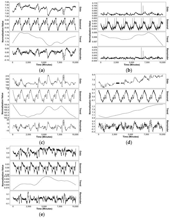 STL decomposition for Inflow Point (461): (a) pH; (b) Turbidity; (c) Electrical conductivity; (d) Temperature; and (e) Chlorine.