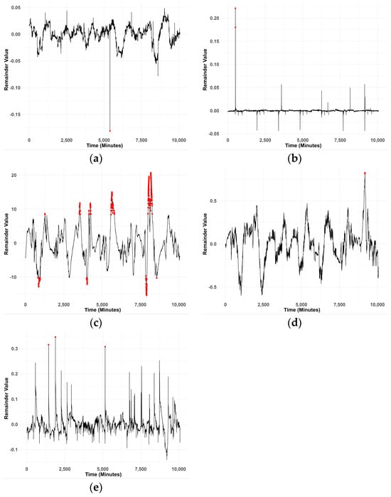 In Figure 4a, moderate to high fluctuations in pH were observed, likely resulting from variations in water quality or chemical dosing adjustments at the treatment plant. Consistent daily patterns in the seasonal component indicated regular influences from chlorine and buffer dosing. The trend revealed an initial rise in pH before stabilization. Turbidity data in Figure 4b showed fluctuations and spikes, with seasonal patterns reflecting system activity and peak usage. The trend displayed a decline at approximately 3000 min followed by a rise. Remainder spikes indicated potential suspended solid intrusion or turbulent water flow. In Figure 4c, electrical conductivity exhibited significant fluctuations associated with change in dissolved salts and inorganic compounds. Seasonal variations corresponded with operational shifts and peak water usage. Trend increases at the beginning and end of the period were observed. Figure 4d showed temperature increases consistent with seasonal change, with daily cycles and environmental conditions influencing the seasonal component. The trend component displayed rising temperatures over time. Residual chlorine, as depicted in Figure 4e, fluctuated due to disinfection adjustments and usage variations. The seasonal component demonstrated consistent daily changes from routine chlorine use, while sudden drops in the remainder were identified.