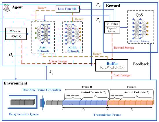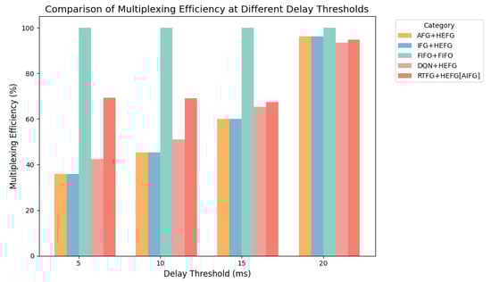 Figure 8, the multiplexing efficiency of the AIFG algorithm is higher compared to the IFG + HEFG, AFG + HEFG and DQN + HEFG algorithms under smaller delay requirements. With a delay requirement of 5 ms, AIFG’s multiplexing efficiency is 69.25%, which is an increase of 92.36% over both AFG + HEFG and IFG + HEFG, and an increase of 63.2% over DQN + HEFG. Under a delay requirement of 10 ms, the multiplexing efficiency of the AIFG algorithm is 69.1%, which is 52.47% higher than that of the AFG + HEFG and IFG + HEFG algorithms, and an increase of 35.5% over DQN + HEFG. At a 15 ms delay requirement, AIFG’s multiplexing efficiency is 12.26% higher than that of AFG + HEFG and IFG + HEFG, while it is only 3.2% higher than that of DQN + HEFG. When the delay requirement is 20 ms, the multiplexing efficiency of AIFG reaches its maximum value of 94.7%, with an increase of 1.4% compared to DQN + HEFG, but with a slight decrease compared to AFG + HEFG and IFG + HEFG. When the delay requirement is high, the multiplexing efficiency improvement rate of AIFG decreases. This is constrained by the time threshold and influenced by the fixed AOS transmission frame size. Nevertheless, the overall trend in multiplexing efficiency remains upward. Among learning-based methods, AIFG shows better multiplexing efficiency than DQN + HEFG, especially under strict delay conditions (5 ms, 10 ms), indicating a more refined policy learned through PPO.