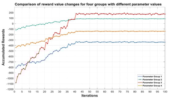 Figure 5 clearly shows the mainstream trend of the reward function, which gradually rises in the early stage of training. When the number of iterations is about 40, it begins to stabilize and enters the platform period, indicating the convergence of the reward function. Among the four parameter groups selected, the growth rate of the convergence function is the fastest in the case of Parameter Group 3, and the growth rate of the Parameter Group 2 is slower. At the same time, the convergence effect of Parameter Groups 1, 3 and 4 is better, but the convergence effect of Parameter Group 2 is poor.