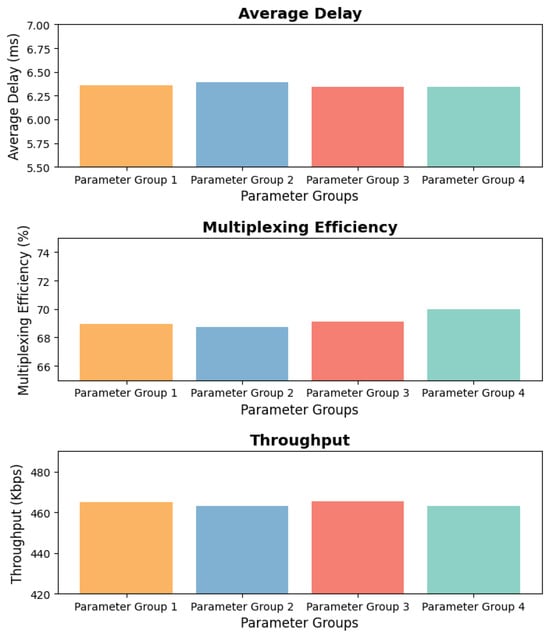 Figure 6, it can be observed that the average delay and throughput are optimal for Parameter Group 3, while the multiplexing efficiency is highest for Parameter Group 4. Overall, selecting Parameter Group 3 for AIFG algorithm training is the most optimal choice.