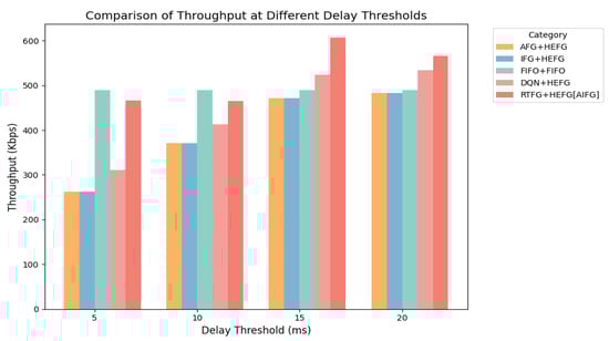 Figure 7, it can be seen that the throughput of the AIFG algorithm is generally higher compared to other frame generation algorithms. When the delay requirement is 5 ms, the throughput of the AIFG algorithm is 466 Kbps, which is an increase of 78.05% over both the AFG + HEFG and IFG + HEFG algorithms. With a delay requirement of 10 ms, the throughput of AIFG is 464 Kbps, which is an increase of 25.37% compared to that of AFG + HEFG and IFG + HEFG. When the delay requirement is 15 ms, the AIFG algorithm achieves the maximum throughput of 606.456 Kbps, which is 28.66% higher than that of the AFG + HEFG and IFG + HEFG algorithms. At a delay requirement of 20 ms, the throughput of AIFG also improves, with an increase of 17.18% compared to both AFG + HEFG and IFG + HEFG. The AIFG consistently exhibits superior throughput, especially under 5 ms and 10 ms delay thresholds, where it outperforms DQN + HEFG by margin of 49.9% and 12.7% respectively. Under 15 ms and 20 ms delay thresholds, the throughput of AIFG is 15.8% and 6.1% higher than that of DQN + HEFG, respectively. When the delay requirement is low, AIFG shows a higher throughput improvement rate, and its performance change is optimal. Conversely, when the delay requirement is high, AIFG is able to achieve a larger throughput value. This highlights the effectiveness of PPO in guiding reward shaping and decision making over longer time horizons.
