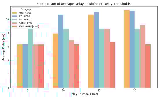 Figure 9 shows that AIFG consistently exhibits the lowest delay across all time requirements, outperforming all other methods. This is especially noticeable under higher time requirements (15 ms and 20 ms), where the delay is substantially smaller. Meanwhile, the FIFO-based method exhibits slower processing times due to its inherent characteristics. With a delay requirement of 5 ms, the average queue delay for AIFG, DQN + HEFG, AFG + HEFG, and IFG + HEFG is almost the same, ranging from 6 to 7 ms. However, at a 10 ms delay requirement, AIFG’s average queue delay is reduced by 19.39% compared to AFG + HEFG and by 40.33% compared to IFG + HEFG and by 8.9% compared to DQN + HEFG. At a 15 ms delay requirement, AIFG’s average queue delay decreases by 37.30% compared to AFG + HEFG and by 39.62% compared to IFG + HEFG and by 22.1% compared to DQN + HEFG. At a 20 ms delay requirement, AIFG’s average queue delay is 43.90% lower than AFG + HEFG and 43.45% lower than IFG + HEFG and 30.3% lower than DQN + HEFG. When the delay requirement is low (e.g., 5 ms), the queue length typically does not exceed the AFG threshold, so the algorithm’s performance is similar to that of AFG, and the advantages of AIFG are not fully manifested. However, when the delay requirement is high, AIFG dynamically optimizes the gap between frames, reducing delays and improving overall performance by adapting to changing conditions in the transmission environment. In this part, DQN + HEFG performs better than traditional rule-based approaches (AFG/IFG + HEFG) but does not reach the stability and optimization level of PPO-based AIFG. The simulation results validate the adaptability of the AIFG algorithm under varying delay requirements and the advantage of AIFG in reducing average queue delay.