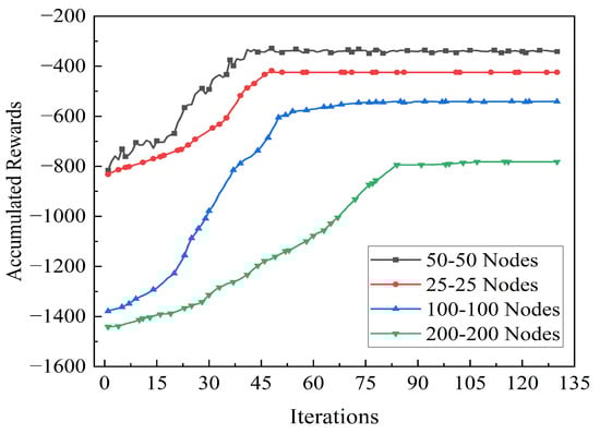 Figure 10, the reward sum becomes negative in large-scale cases due to an increased queuing delay. In contrast, for smaller networks (25 and 50 nodes), the algorithm achieves convergence within fewer episodes and yields positive reward values. Notably, the algorithm’s accumulated reward converges well even in large-scale environments.