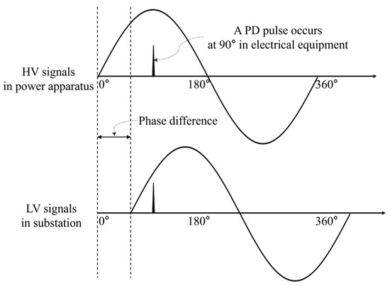 Among various PD detection techniques, single-pulse analysis and PRPD analysis have been applied to the identification and classification of PD defects. Especially, the PRPD pattern analysis, which interprets repetition rates (n), amplitudes (q), and phase angles (ϕ) of PDs under alternative current (AC) conditions, is widely used for insulation condition monitoring of the gas-insulated equipment [17,18,19,20]. Since the accuracy of identification and classification of the types of insulation defects using PRPD pattern recognition is highly dependent on phase information, especially zero-crossing (ZC) points, it is essential to synchronize PD signals with the phase angles of the applied HV signals. However, in many field PD measurement cases, there are a lot of challenges in obtaining accurate phase information of the applied HV signals to identify and classify the types of insulation defects using PRPD pattern analysis methods. The phase difference between the applied HV signals on the power equipment and the AC 110/220 V signals used in the substations occurs as shown in Figure 1 [21,22]. Therefore, this study employed the PRPD sensor, which was embedded in the medium voltage (MV) class bushing for the acquisition of the phase-synchronized PD signals with applied HV signals without any additional synchronization devices.