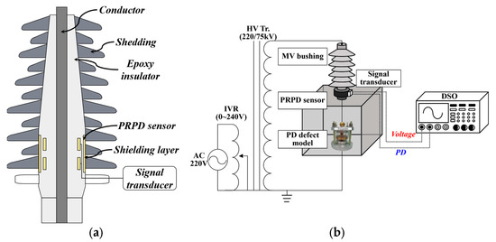 Configurations: (a) PRPD sensor embedded in MV bushing and (b) experimental setup.