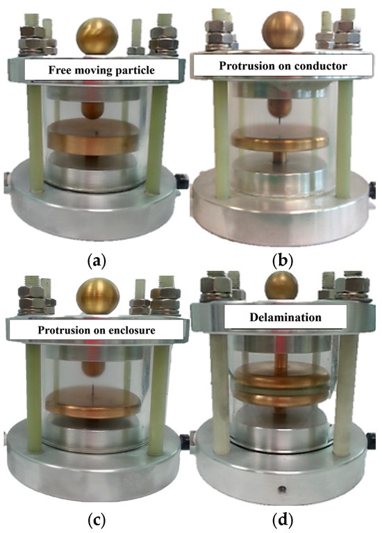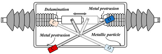 PD detection has been carried out using an important indicator for the insulation condition monitoring of power apparatus. Figure 3 shows typical insulation defects in the GILB. Although there are a lot of cautions to prevent contamination during processes of manufacture, assembly, installation, and open and close operations, tiny particles are sometimes still present in the enclosure. When the metallic particles are forced by the electric field of the applied voltage, they can roam freely along the enclosure. It generates PD signals, and its PD characteristics, such as amplitudes, rising and falling times, and pulse width, depend on their weight, size, and shape [34,35]. If the metallic particle is stuck on the conductor by the magnetic force, the electric field can be concentrated on the tip of the protrusion, resulting in corona-type PD pulses [6,36,37]. On the other hand, a delamination defect can be produced by physical impact by electrical or mechanical stress or thermal expansion and contraction [38,39,40]. If an insulator with the delamination defect is In the HV equipment and the electric field by the applied voltage Is sufficiently high, the PD signals are generated by the electron avalanche phenomenon of free electrons inside the delamination. Once the electric field is concentrated on the delaminated area, it can deteriorate the dielectric strength of the insulation material. These discharges initiate electrical tree propagation, the insulation layers can be degraded and deteriorated, and it can finally lead to the failure of the insulation system [41,42].