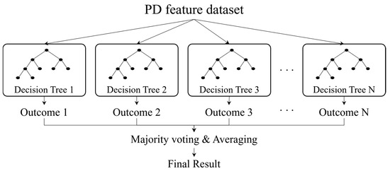 The RF algorithm is an ensemble learning algorithm that is a combination of a set of tree predictors and has been widely used for identification and classification tasks for insulation defects due to its effectiveness in handling non-linear and high-dimensional datasets. Each decision tree is constructed using randomly sampled datasets of feature spaces, ensuring the diversity and robustness of the algorithm. Typically, the RF algorithm operates on the majority voting across the trees, thereby improving generalization and reducing overfitting. This mechanism can reduce variance while maintaining a low bias [43,44,45]. Figure 5 shows the general structure of the RF algorithm.
