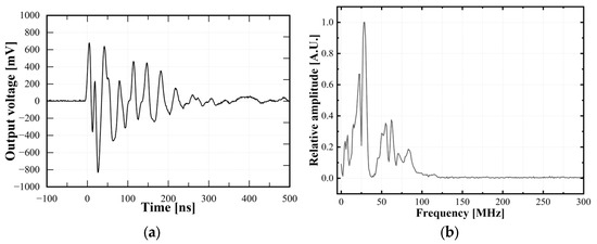 Figure 7 shows a typical PD pulse and its FFT waveform. In this study, the FFT was applied to the PD single pulses in the discrete-time domain, where N denotes the total amount of sampled data. The PD signal was measured with a maximum sampling frequency of 2 GHz, ensuring sufficient resolution for PD signals with high-frequency components. Two dominant peak frequencies were extracted from the FFT spectra:
