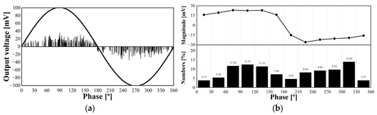 Typically, the PD single-pulse analysis method has been used due to its ease of application and quick identification with intuitive interpretation, while the PRPD pattern analysis method has been widely applied to insulation defect recognition with high accuracy by expert analysis systems with advanced capabilities [33,54,55,56]. According to the oscillating appearance of PD single pulses with EM wave detection characteristics [57], the first and second half-cycles of the single pulses have distinguishable information. On the other hand, due to the periodic polarity reversal of the sinusoidal waves in AC voltage [58], the PRPD pattern varies with the phases of the applied HV signals. Thus, the acquisition of PD pulses at regular phase intervals provides critical information for distinguishing among different types of insulation defects.