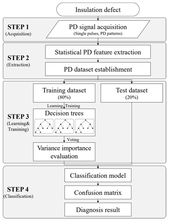 In this paper, the RF algorithm was applied to classify and identify the different types of insulation defects in GILB. Figure 10 shows the proposed diagnostic process for insulation defects using the RF algorithm used in this paper. The process consisted of four steps. The first step was the acquisition of PD signals corresponding to various PD defect models. In the second step, statistical PD features were extracted, and PD datasets were constructed. As explained in Section 3, PD pulses contain a lot of informative characteristics, including time-domain, frequency-domain, physical shape-domain, and phase distribution-domain features. In the third step, the constructed PD datasets were divided into training (80%) and test (20%) subsets for the RF algorithm development [31,67,68]. The RF algorithm, consisting of multiple decision trees, was trained using the training subsets. Each decision tree in the ensemble was independently trained and learned, and a voting mechanism aggregated individual predictions. In addition, variance importance analysis for identifying the greatest influences on the performance of the RF algorithm was conducted. Top-ranked features were selected to improve the efficiency of the RF algorithm by reducing computational times and costs without compromising the accuracy of PD identification and classification. In this study, the RF algorithm was employed to classify the insulation defect types using statistical PD features. The third and fourth steps were only conducted with the RF classifier algorithm to identify the insulation defect types.