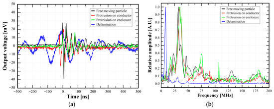 PD single pulses and their FFTs in accordance with PD defect models: (a) PD single pulses; and (b) their FFT spectra.