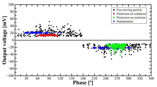 The PD detection techniques consist of the electrical detection method based on the IEC 60,270 [7] and non-electrical detection methods based on IEC 62,478 such as acoustic emission (AE) and ultra-high-frequency (UHF) methods [8]. The electrical detection method uses a coupling capacitor (CC), which can measure the quantification of PDs and has output measurements in terms of picocoulombs (pC) with high precision. However, there is still a significant challenge in installing a sufficient capacity coupling capacitor for quantitative measurements in the field measurements, particularly for diagnosing power equipment [9,10]. To overcome the shortage, alternative non-electrical detection methods have been increasingly developed with excellent sensitivity and signal-to-noise (S/N) ratio in the high-frequency range [11]. The AE method has been widely used in power equipment for its low price and easy installation compared to other sensors [12,13]. The UHF method has been adapted to the PD measurement standard of GIS by detecting electromagnetic (EM) waves induced by the PD pulses originating from insulation defects with a high-frequency range from 300 kHz to 3 GHz [6]. These alternative methods have various advantages, such as fault location estimation based on the time of flight (TOF) techniques and continuous condition monitoring in on-site measurement [14,15]. Despite these advantages, the alternative nonconventional methods still have the following limitations: the output magnitudes cannot be calibrated in terms of pC, and the signal distortions caused by the complex internal structures of power equipment must be considered [10,15,16]. Moreover, in terms of PRPD analysis, which is the most frequently used in online PD identification, those alternative detection methods need additional synchronization devices since they could not obtain phase information of the applied voltages.