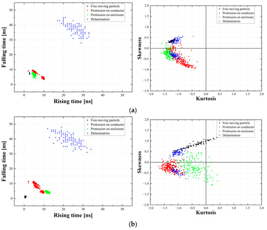 Scatter plots in accordance with time and physical-domain features in accordance with PD defect models: (a) 1st half cycle; and (b) 2nd half cycle.