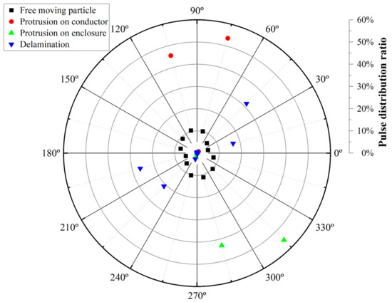 PRPD pattern analysis has been used as one of the most efficient recognition techniques for recognizing insulation defects in the GIS and GILB. The PRPD pattern obtains PD pulses with reference to phase angles of the applied voltages and consists of three key components: magnitude (q), phase (ϕ), and numbers (n) of the occurrence of PD pulses under AC voltage conditions [66]. In this paper, the PRPD patterns were divided into 30-degree phase angle intervals based on the ϕ-q-n representation to analyze the pulse distribution characteristics. Figure 9 shows the PRPD pattern and its phase distribution-domain features, average magnitudes, and number of PD pulses over 30-degree intervals.