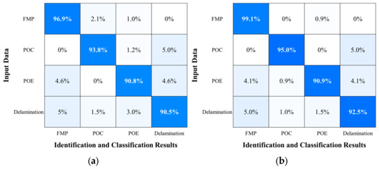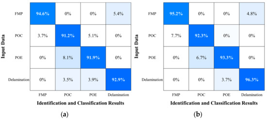 Confusion matrices of PD single pulses: (a) all features; and (b) top-ranked key features.