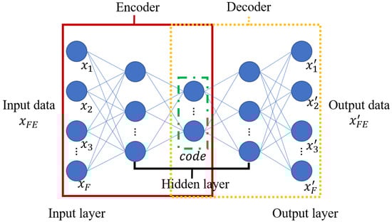 Autoencoder represents an unsupervised learning method []. As illustrated in Figure 1, the architecture consists of three primary components: the input layer, the hidden layer, and the output layer, which form the encoder and decoder structures.