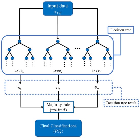 Random forest constitutes a supervised learning algorithm and an enhanced variant of the decision tree methodology []. The training process constructs multiple decision trees to establish a random forest structure. As shown in Figure 2, the algorithm builds n decision trees using the training dataset and then performs majority voting on predictions for input data xFE across all trees to determine the final classification outcome.